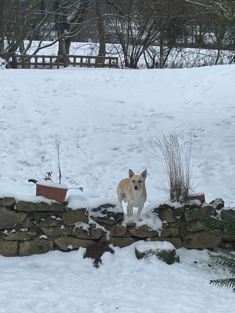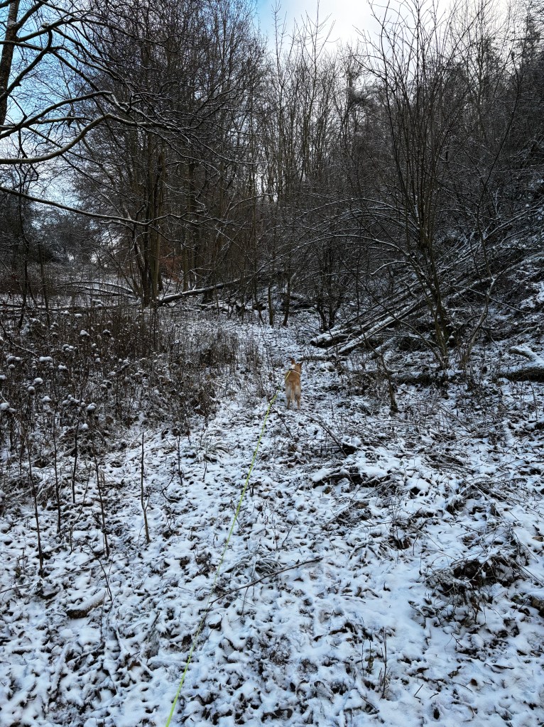 Die beiden letzten Wochen war es nur kalt und draußen war alles gefroren. Man hat im Januar das Gefühl, alles steht still und wartet auf einen Neuanfang. Es wird spät hell und früh wieder dunkel. Benji hat wenigstens Spaß im Schnee. Ab und zu gehen wir auch Wege, die ein wenig abseits der üblichen Routen liegen.