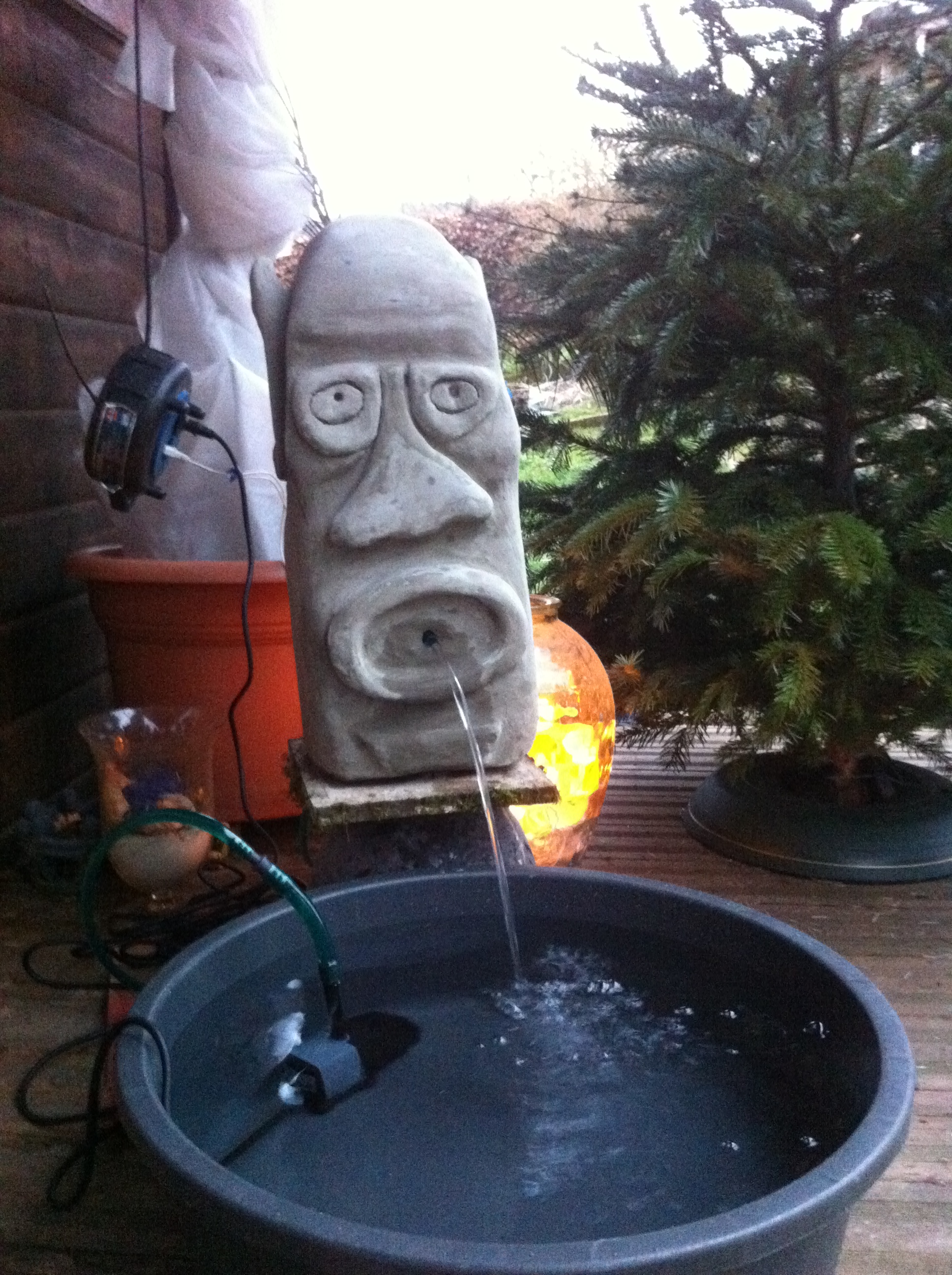 Aus einem Ytong Stein entstanden und in mühevoller Arbeit Struktur und Ausdruck heraus gearbeitet. Am Ende noch mit Fertigzement gestrichen und derzeit mal testweise auf der Terrasse aufgestellt. Eine kleine Teichpumpe angeschlossen und schon spuckt er Wasser. Wir werden wohl im Frühjahr einen Wasserbehälter vor dem Haus vergraben und den Kleinen dort aufstellen. Auf die Reaktion der Nachbarn bin ich jetzt schon gespannt; und mal sehen ob er noch Zuwachs bekommt. Ich würde mich freuen ……..