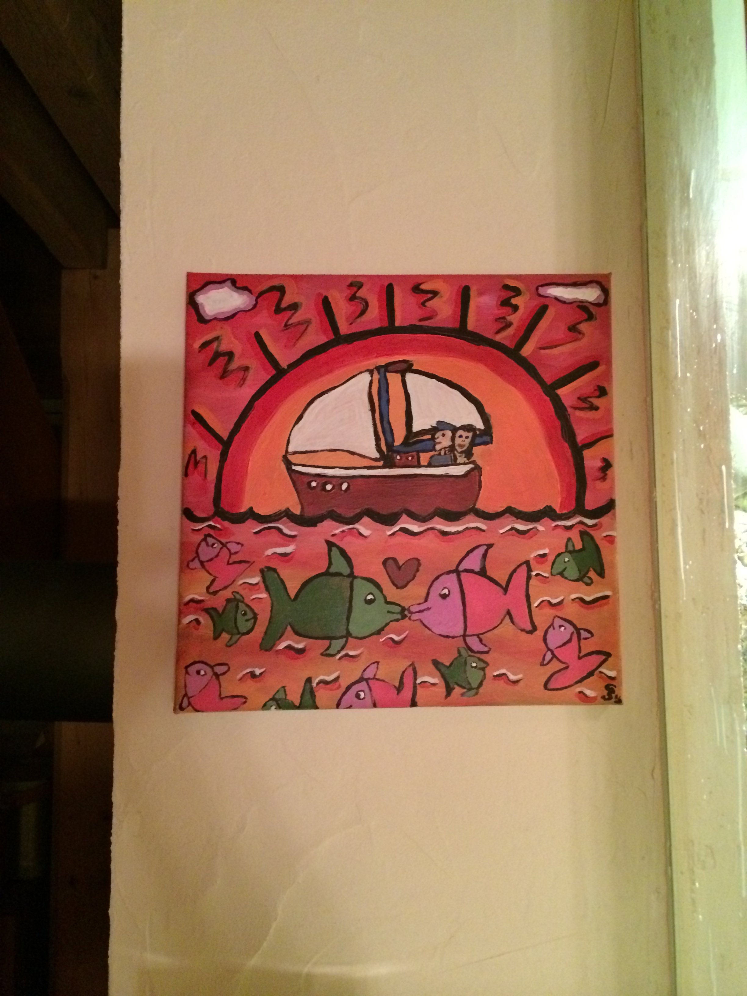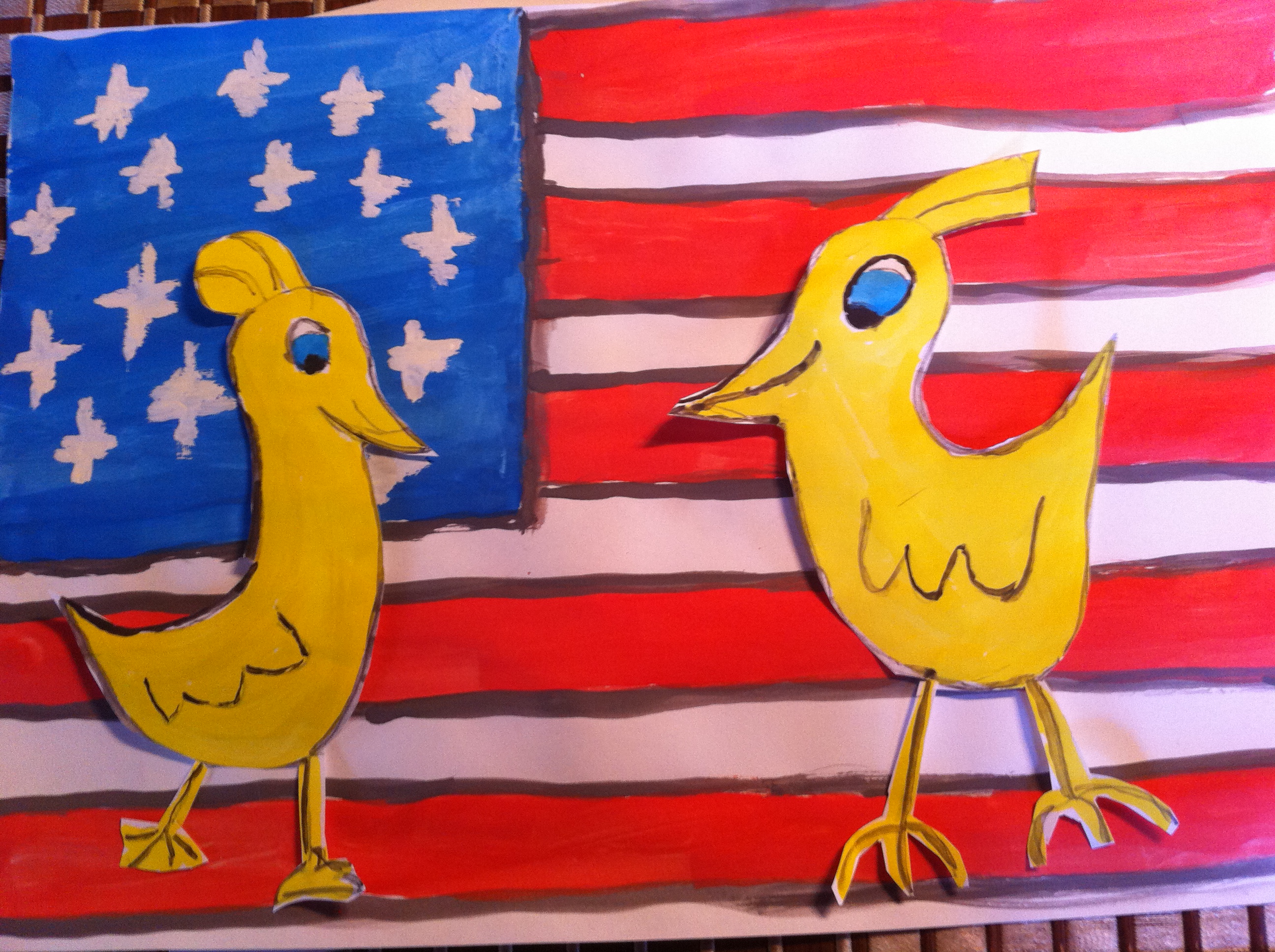 Ich kannte James Rizzi bis jetzt noch nicht; bzw. habe seine Werke bis jetzt noch nicht so wahrgenommen. Wir haben uns letztes Wochenende bei Silke und Eike über ihn unterhalten und ich muß sagen das mich seine Bilder doch sehr beeindruckt haben. Gaby anscheinend auch. Sie hat die Woche mal ihre Farben aus dem Schrank geholt und die Pinsel geputzt. Und dann mal schnell ein neues Bild für unser Wohnzimmer gemalt. Auch das kleine Bild mit der Amerikanisches Flagge fand ich sehr gelungen.