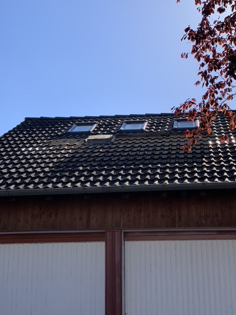 Wer Klaus kennt weiß, wenn er sagt 07:30 Uhr am Samstag, solltest Du mit den Vorbereitungen fertig sein. Also Platz zum Arbeiten hergestellt, Verpflegung sichergestellt und früh aufgestanden. Vielleicht hätte ich die Nachbarn noch vorwarnen sollen. Pünktlich um 07:50 Uhr waren die Ziegel für den Ausstieg für Ralph aufs Dach beseitigt und die Kettensäge wurde angeworfen. Da die Fenster 2 cm breiter als die Dachsparren waren musste ein wenig gesägt werden. Dies geschieht nicht ganz geräuschlos. Ralph hat die (dann wachen) Nachbarn vom Dach aus freundlich begrüßt.