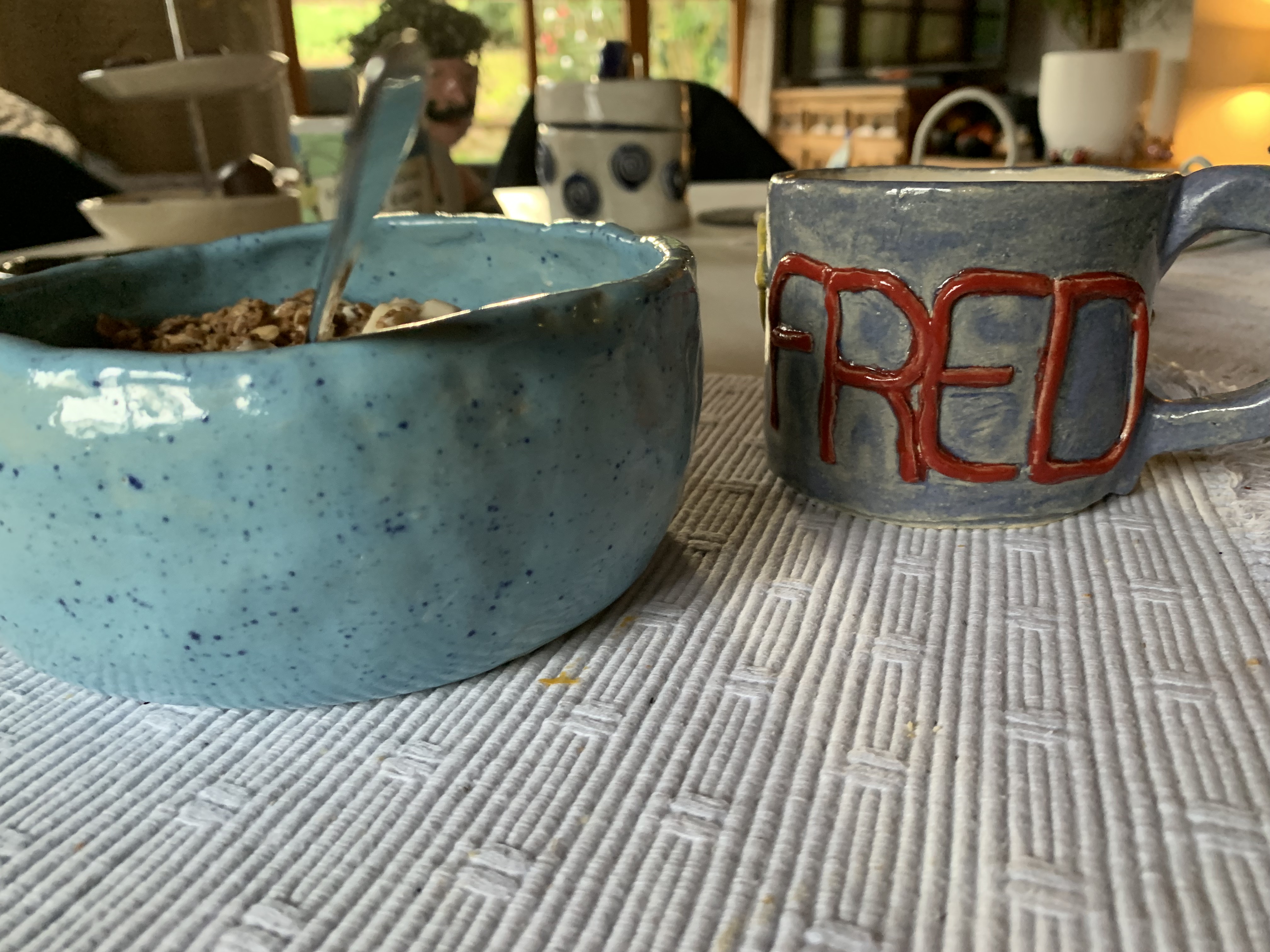 Die ersten Tage genutzt um die Erkältung in den Griff zu bekommen. So langsam wird es besser. Golf geht aus Wettergründen (und der Erkältung) derzeit auch nicht. Aber zu Hause ist es ja auch gemütlich. Heute mit selbstgetöpfertem Geschirr gefrühstückt. Meine sehr liebevoll gestaltete Tasse ist fertiggestellt, die Müslischale ist schon lange im Einsatz: