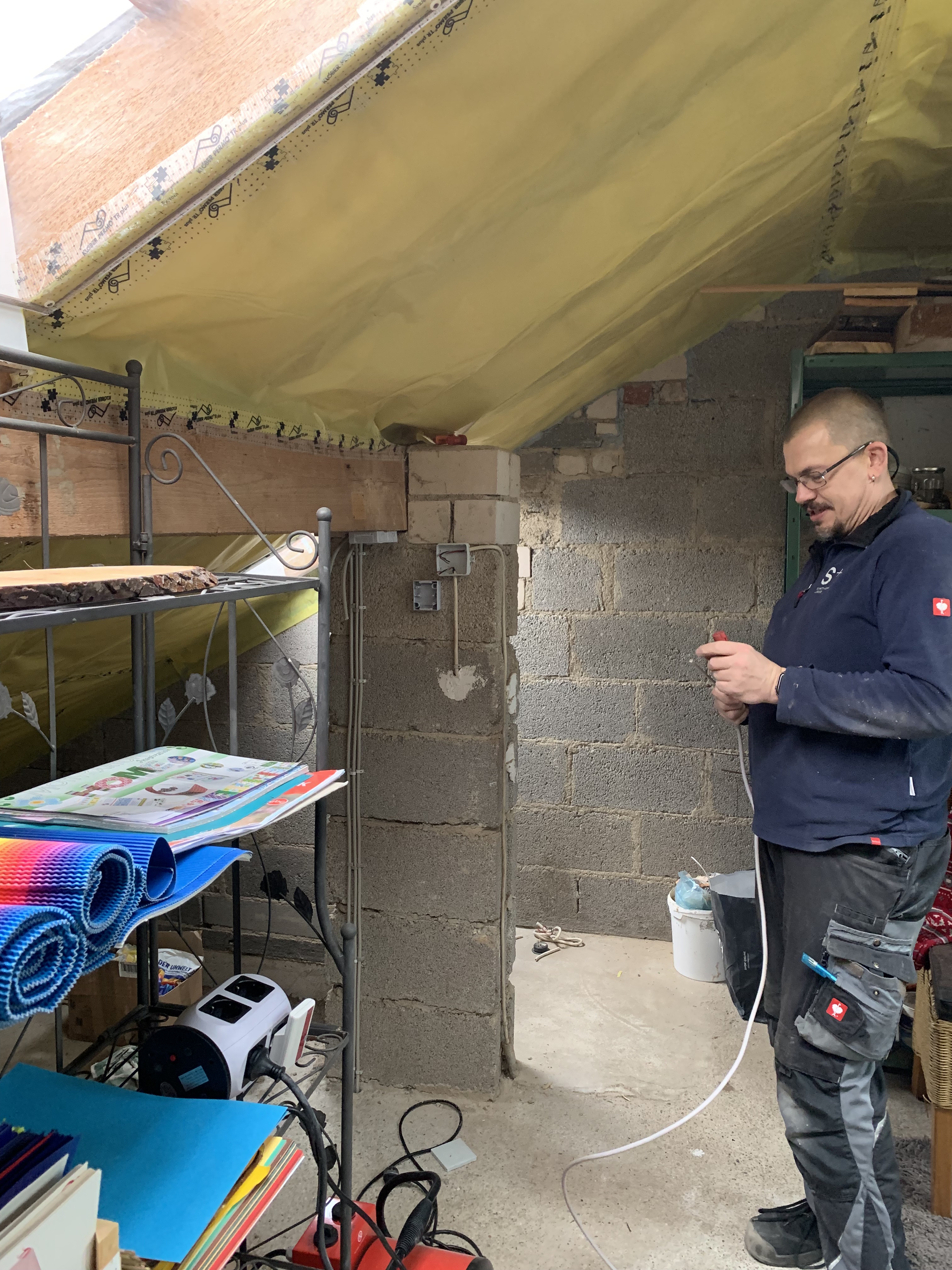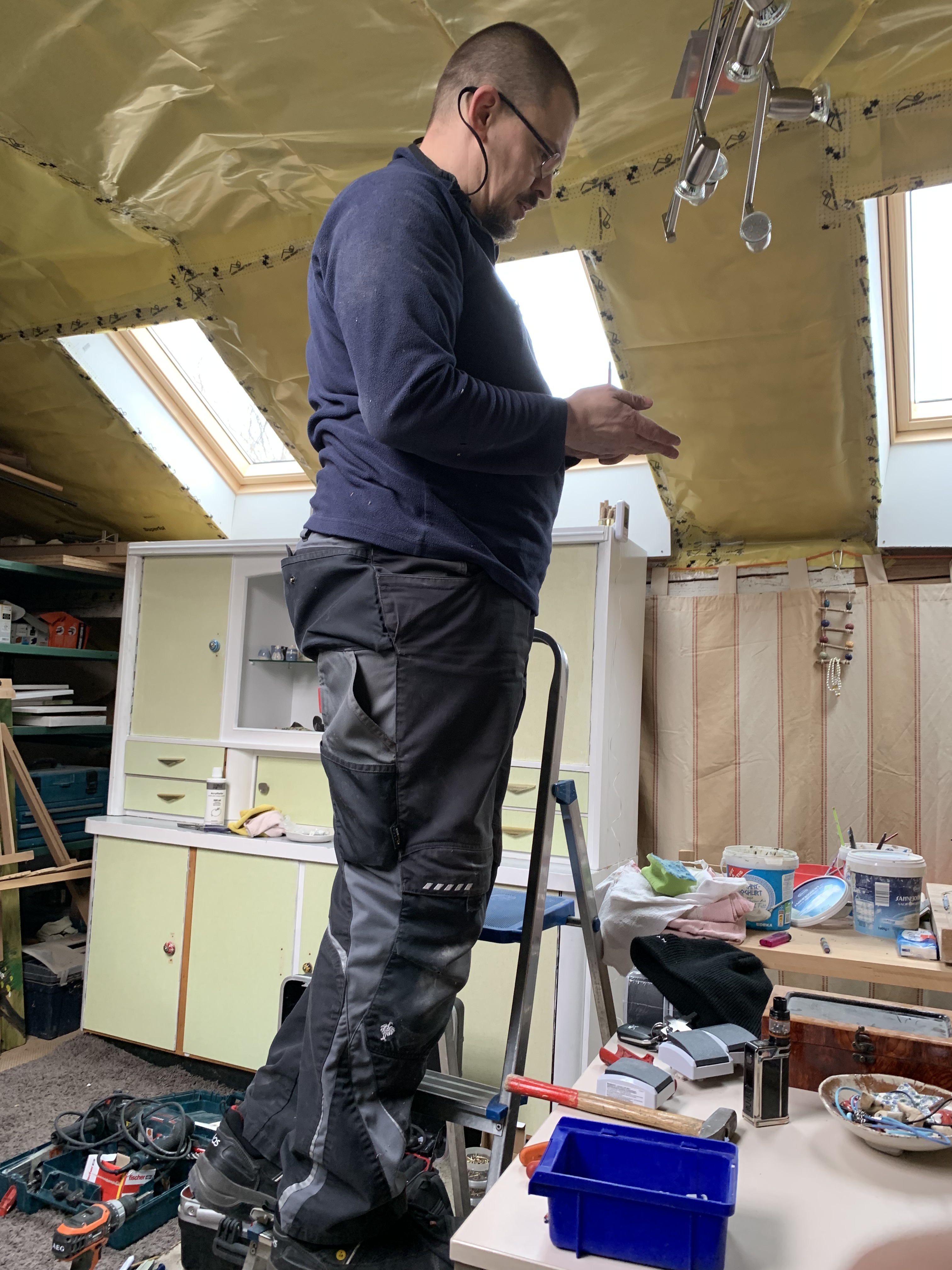 In einer tollen Aktion wurden Leitungen neu verlegt, Betondecken durchbohrt, Steckdosen angebracht, die Lampe montiert und eine „Energie-Station“ über den Arbeitstischen montiert. Der Brennofen wurde jetzt endlich aus der Garage ins Atelier gestellt und wenn es draußen dunkel ist, kann man einfach das Licht anmachen. Der Raum ist jetzt toll ausgeleuchtet und auch sonst voll funktionsbereit. Nochmals vielen Dank an Sven. Ich hätte das nie hinbekommen und ich konnte auch durch mein nicht vorhandenes Fachwissen nur sehr begrenzt Hilfestellung geben.