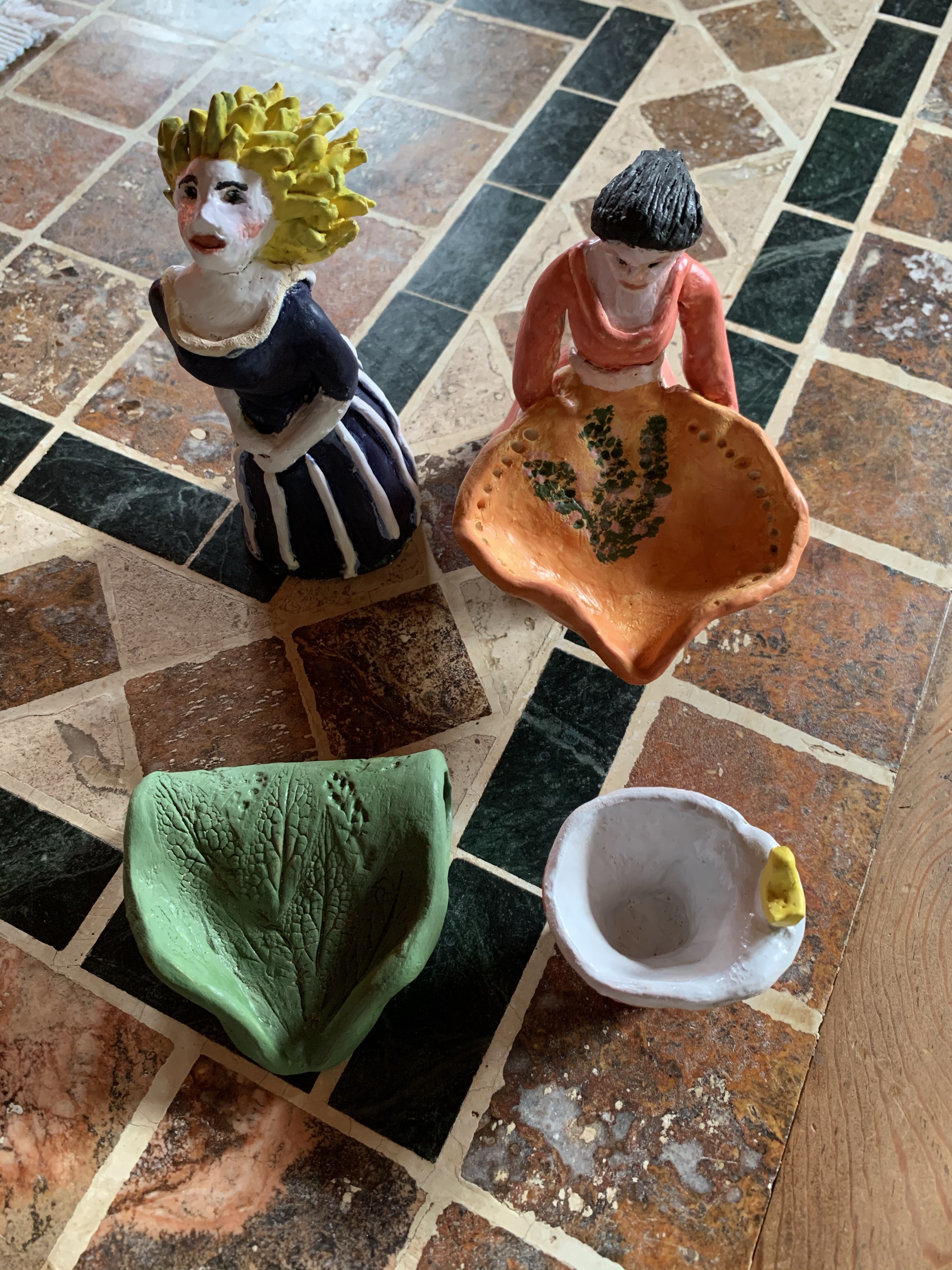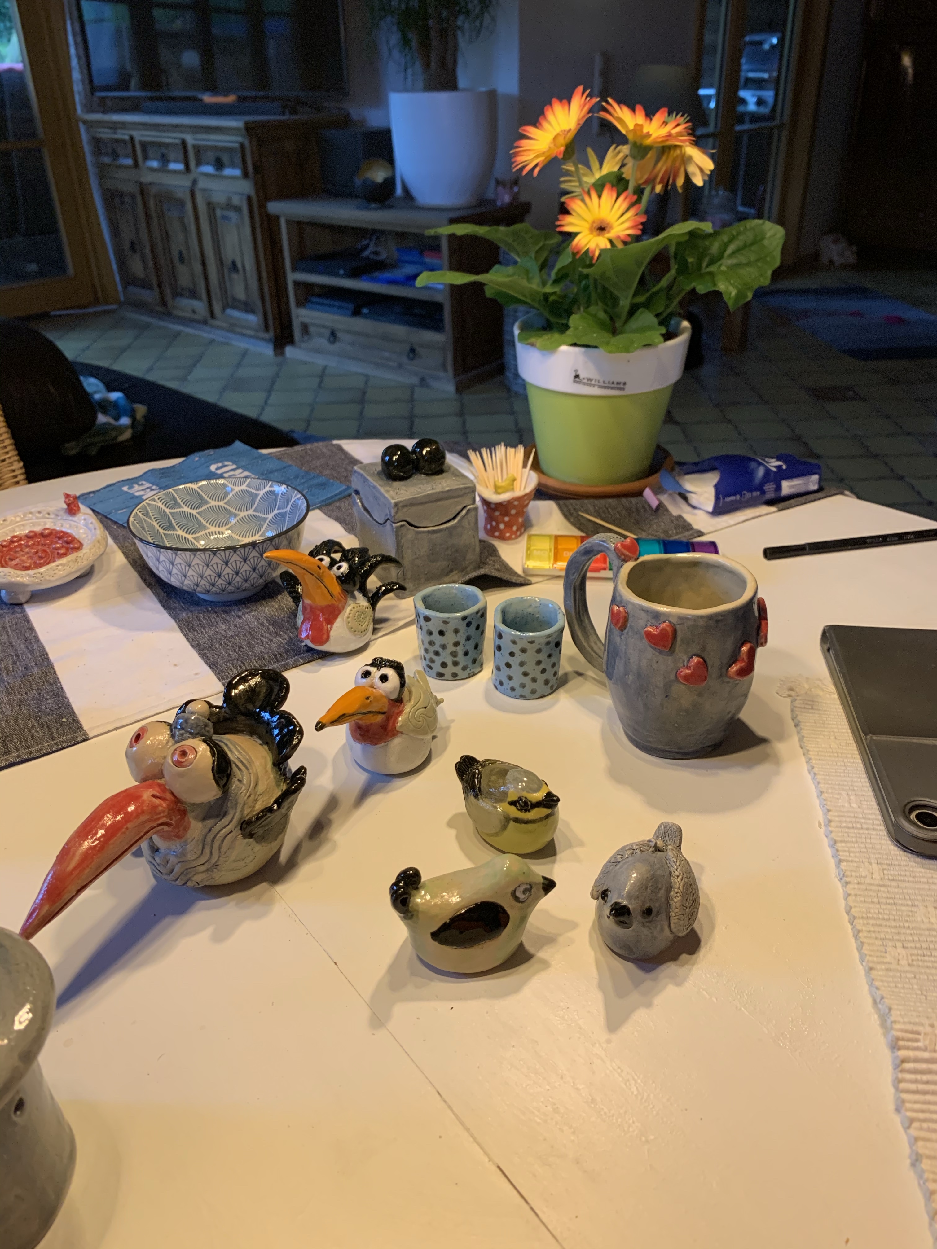 Wie versprochen einige Infos über Gabys Aktivitäten. Nachdem es uns (mit Jürgens Hilfe) gelungen ist, den Brennofen endlich zu reparieren und auf 1.200 Grad zu bringen konnte endlich getöpfert und glasiert werden. Es war aber schon eine rechte Odyssee mit viel Telefonaten mit Bremen (Hersteller des über 30 Jahre alten Ofens) und einem Austausch der Steuerung und der Brennspiralen. Aber jetzt funktioniert endlich alles. Anbei einige Beispiele: